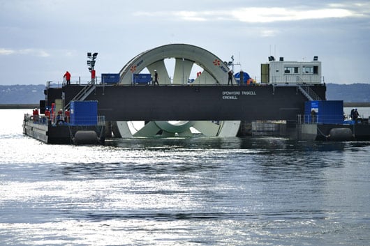 Une barge de 58 m de long a été spécialement conçue pour acheminer l’hydrolienne pilote au large de Paimpol-Bréhat (©EDF, 2011)