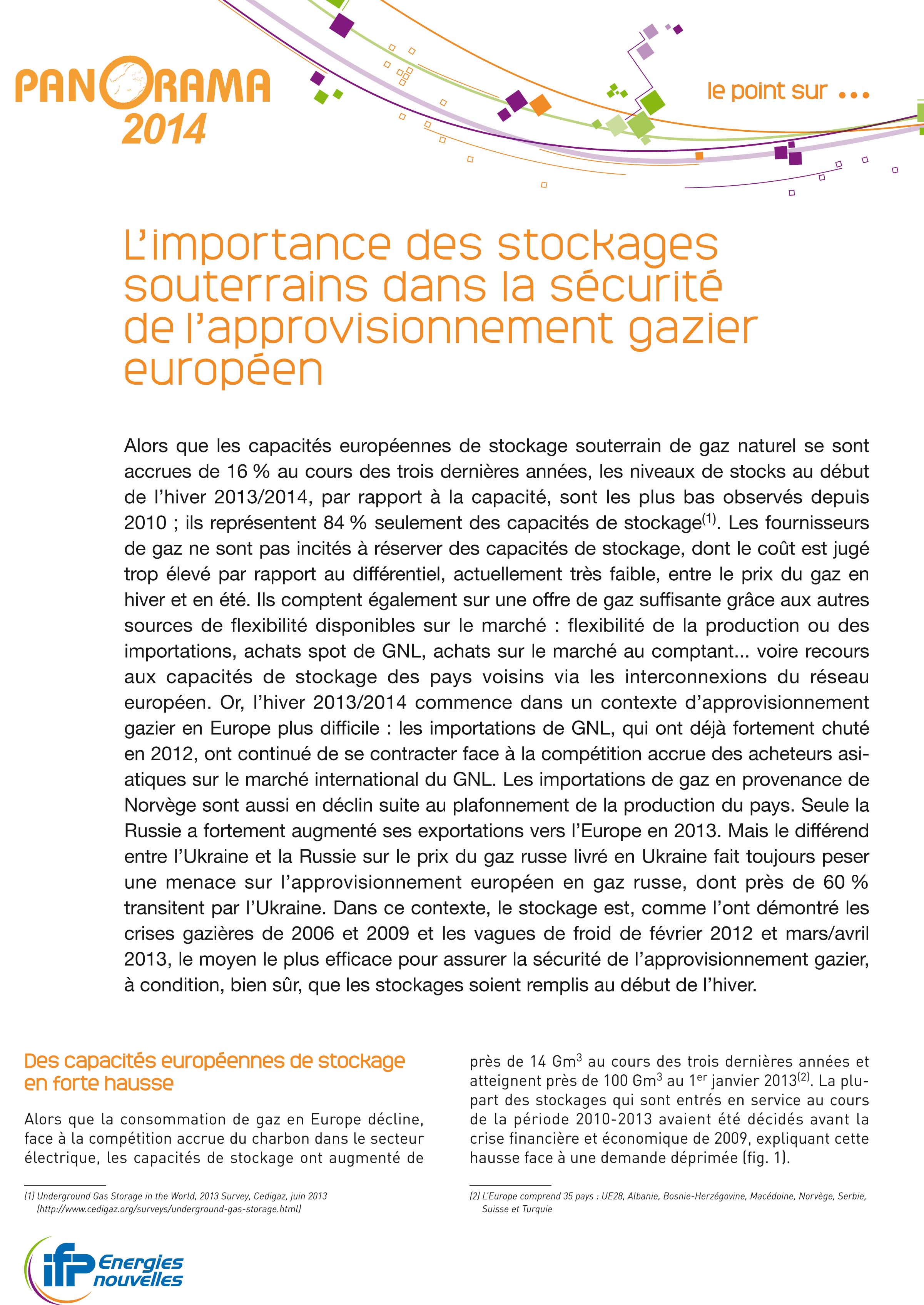 Près de 60% des livraisons de gaz russe vers l’Europe transitent par l’Ukraine. La crise actuelle dans ce pays rappelle la nécessité de disposer de capacités de stockage souterrain significatives pour sécuriser l’approvisionnement gazier européen. Ce besoin d’une source fiable se vérifie également durant les vagues de froid comme en mars/avril 2013.