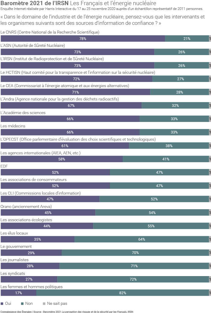 Dans l’enquête d’Harris Interactive, il est également demandé aux Français de juger les différents acteurs du domaine nucléaire (ou abordant les thématiques liées à cette énergie) sur deux critères : la compétence et la crédibilité. Le CNRS, l’ASN (Autorité de sûreté nucléaire) et l’IRSN sont en particulier jugés « les plus compétents et crédibles » parmi les différents acteurs. Les associations écologistes, les journalistes et femmes et hommes politiques souffrent en revanche d’un fort discrédit.
