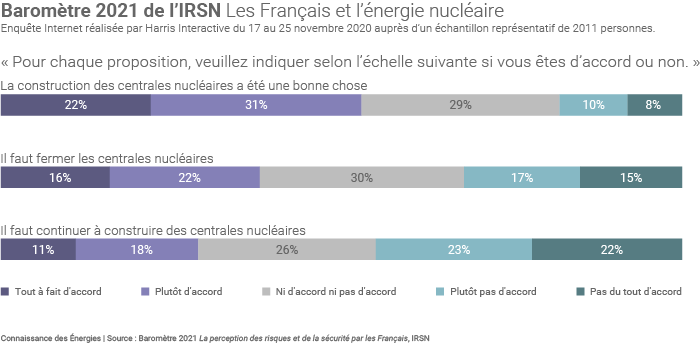 Si le regard sur le parc nucléaire historique s’est ainsi « sensiblement amélioré » selon l’IRSN, le recours à cette énergie à long terme rencontre en revanche une opposition significative : 45% des répondants se disent opposés à la construction de nouvelles centrales, 29% y sont favorables tandis que 26% se déclarent « ni favorables, ni opposés ». Par ailleurs, 38% répondent favorablement à l’assertion « il faut fermer les centrales nucléaires » tandis que 32% la rejettent(4) (30% ne tranchent pas). Le baromètre de l'IRSN indique enfin que seuls 29% des Français se déclarent favorables à la construction de nouvelles centrales nucléaires (26% ne se prononcent pas).