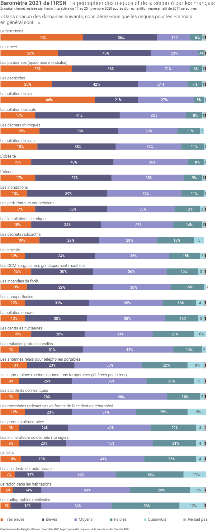 Dans le cadre du baromètre 2021 de l'IRSN, les Français ont été interrogés sur 31 « situations à risque ». Les risques liés aux centrales nucléaires sont jugés « élevés » ou « très élevés » par 41% des répondants, « moyens » par 33% d'entre eux et « faibles » ou « quasi nuls » par les 26% restants. (©Connaissance des Énergies d'après IRSN)
