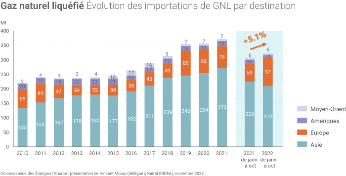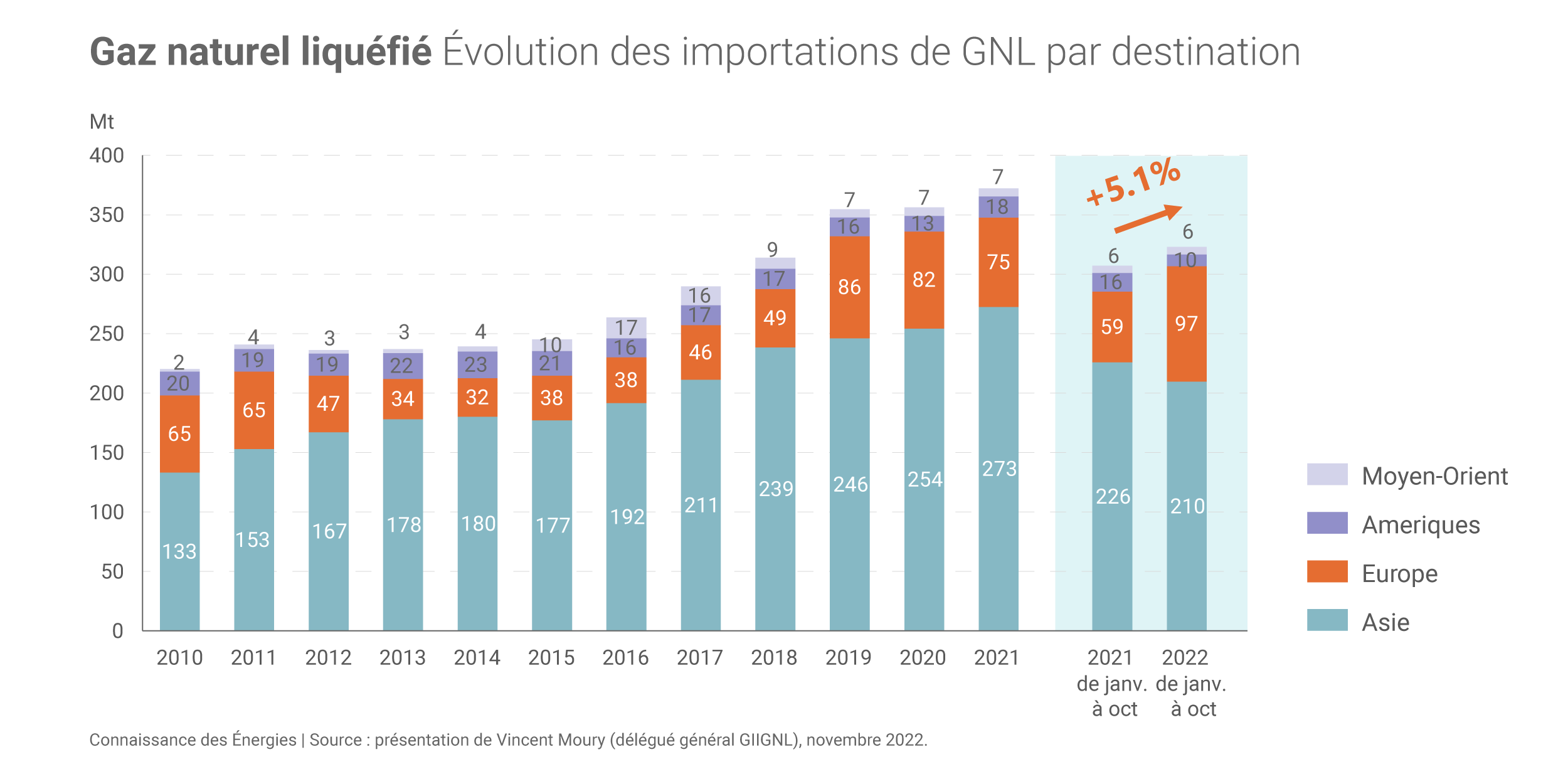 Au total, 16% des importations de gaz fossile de l'UE provenaient de Russie La baisse des importations de gaz russe par gazoduc a été en partie compensée par une envolée des importations européennes de GNL (+ 63% en 2022), notamment en provenance des États-Unis mais aussi en partie de Russie (+ 12% en 2022). Mais les principaux gagnants de ce boom durent les États-Unis (+ 143%) d'après le groupe de réflexion IEEFA (Institute for Energy Economics and Financial Analysis)(5).