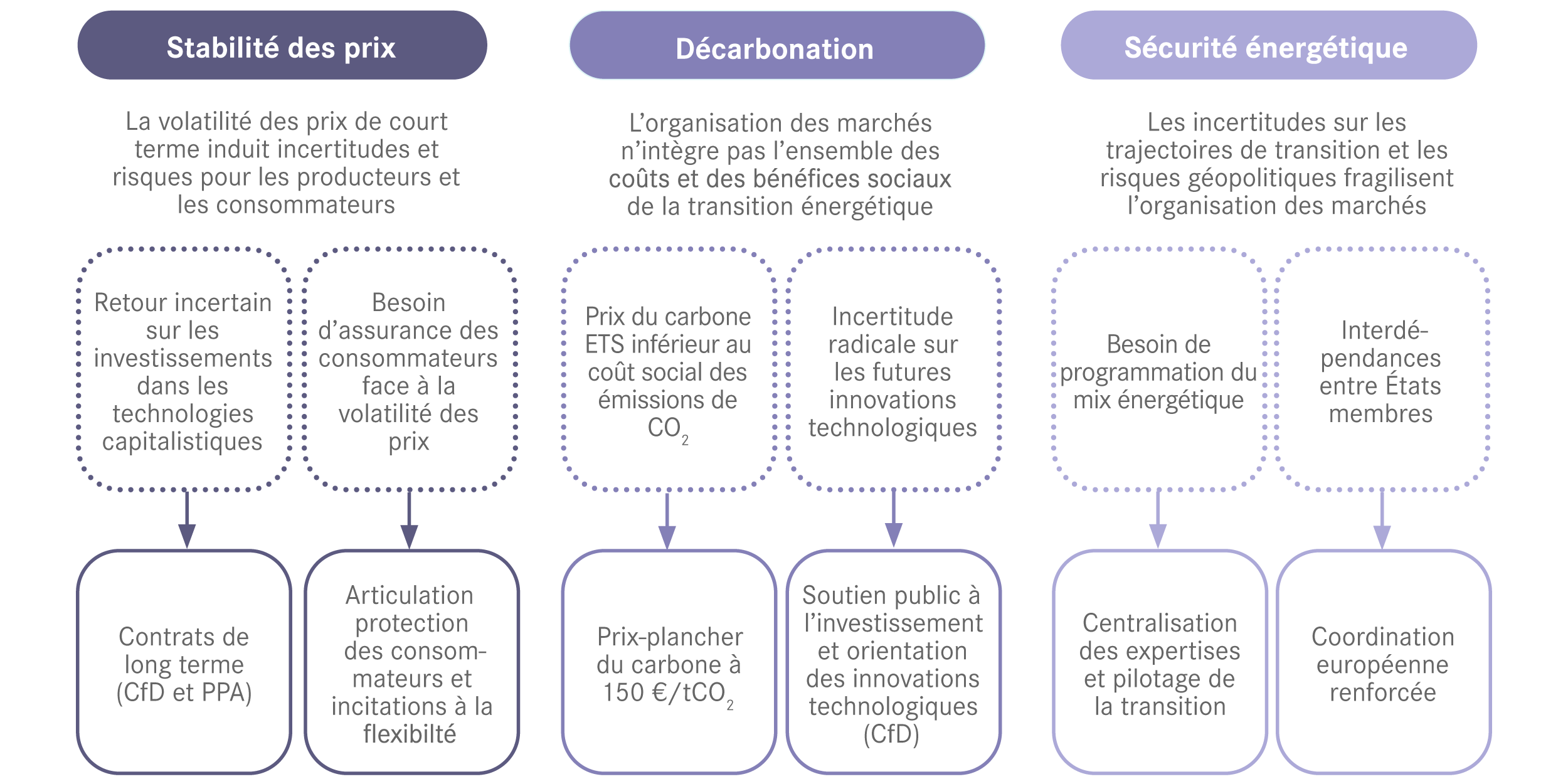 Les marchés de gros « fonctionnent à court terme mais sont inadaptés à long terme pour satisfaire l’ensemble des objectifs » énergétiques de l'UE, constate la note du CAE. Les auteurs soulignent en particulier que le marché de gros journalier est « incomplet car il n’incite pas aux investissements en technologies bas carbone, faute de produire un signal de long terme crédible qui assurerait à l’investisseur la couverture de ses coûts complets pour des équipements capitalistiques » et « ne permet pas de limiter la volatilité des prix ».