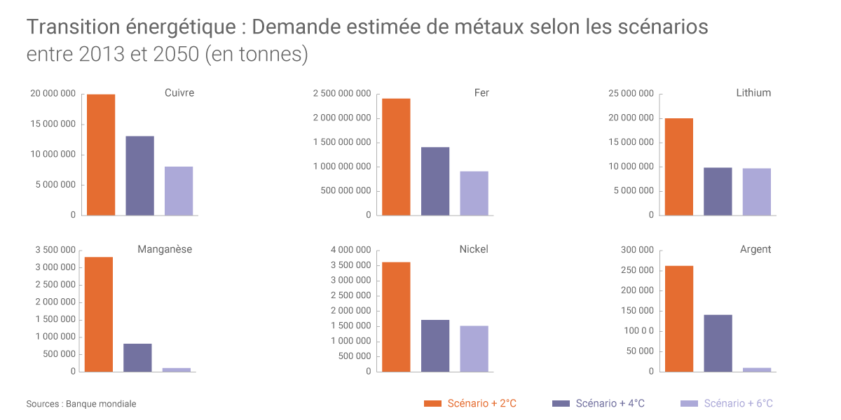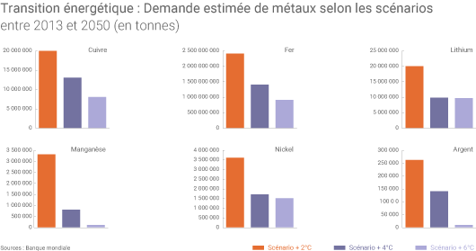 La fabrication en masse de batteries lithium-ion pourrait en particulier engendrer une très forte augmentation des besoins de lithium mais aussi d‘aluminium, de cobalt, de manganèse, de nickel ou encore d’acier. La demande de métaux liée à cette filière pourrait ainsi être multipliée par 10 d’ici à 2050 dans le cas d’un scénario « 2°C » par rapport à un scénario « 6°C » (en l’absence d’efforts pour réduire les émissions de gaz à effet de serre), selon les estimations du rapport.