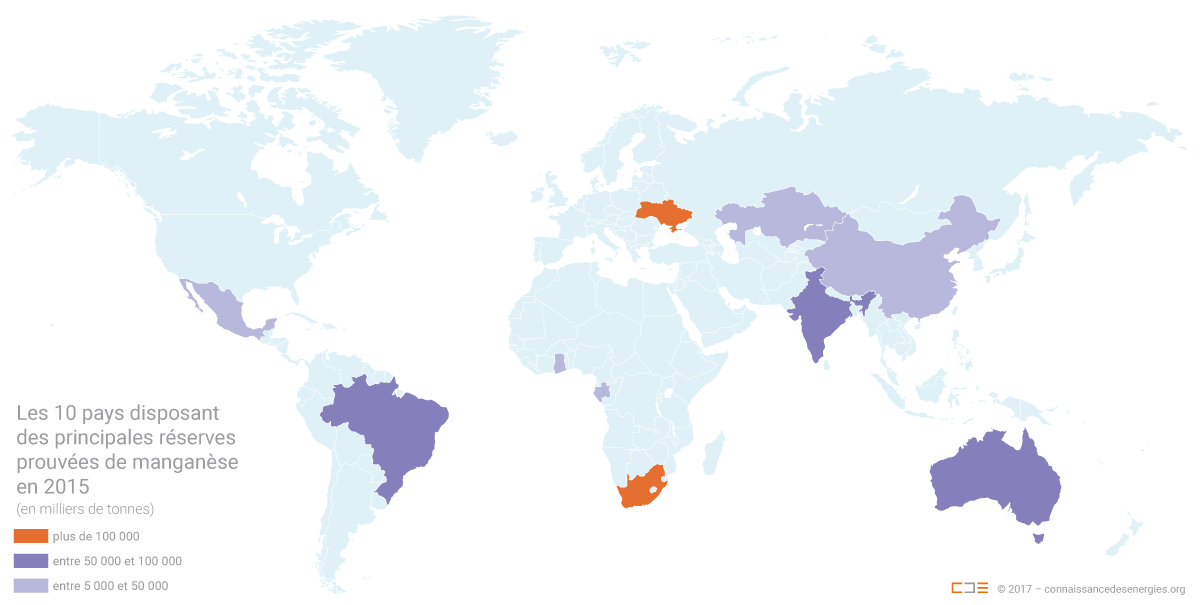 Selon l’U.S. Geological Survey, l’Afrique du Sud pourrait disposer de 75% des ressources mondiales de manganèse. (©Connaissance des Énergies, d’après Banque mondiale)