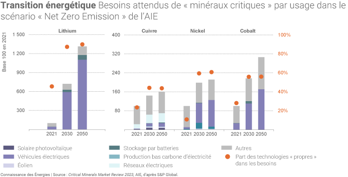 Entre 2017 et 2022, la consommation mondiale de lithium a plus que triplé, celle de cobalt a augmenté de 70% tandis que celle de nickel a progressé de 40%. Et le secteur énergétique est le principal acteur de cette progression accélérée. Les investissements dans le développement de « minerais et métaux critiques » (en particulier le lithium, le cuivre et le nickel) ont dans ce contexte augmenté de 30% en 2022 par rapport à 2021. L'AIE souligne en particulier une hausse record des investissements dans l'exploration de lithium (+ 40% au Canada et en Australie en 2022).