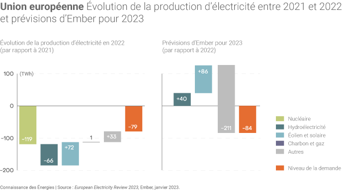 - la sécheresse durant l'été 2022 a fait drastiquement chuter la production hydroélectrique de l'UE « à son plus bas niveau depuis au moins 2000 » (- 19% par rapport à 2021).