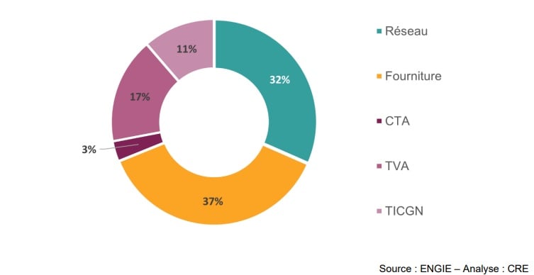 À fin 2025, le coût de fourniture comptait pour environ 37 % du prix repère du gaz selon la CRE, contre 32 % pour les coûts de réseaux et environ 31 % pour les taxes(1).