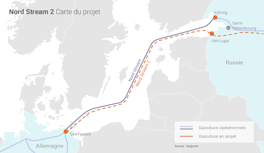 Nord Stream 2 est un gazoduc sous-marin allant de la Russie à l’Allemagne via la mer Baltique. Il suit un tracé proche de celui du gazoduc Nord Stream 1 mis en service en 2012 et dispose d’une capacité similaire de transport de 55 milliards de m3 de gaz naturel par an (via 2 pipelines ayant chacun une capacité de 27,5 Gm3 par an), soit environ un tiers des 153 milliards de m3 de gaz achetés annuellement par l'UE.