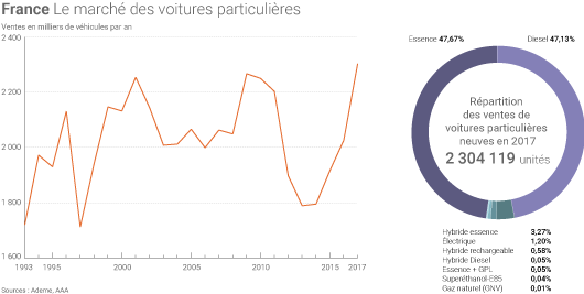 En 2017, près de 2,3 millions de voitures particulières neuves ont été vendues en France, dont 47,7% à motorisation essence, soit davantage que les véhicules à motorisation Diesel (47,1% des ventes) pour la première fois depuis 17 ans. À eux deux, les constructeurs français PSA et Renault ont compté pour plus de 56% de l’ensemble de ces ventes de voitures particulières l’an dernier.