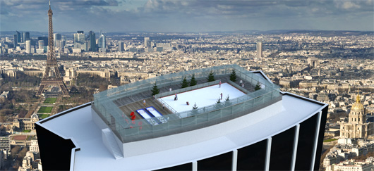 Une patinoire synthétique de 210 m2 est actuellement installée au 59e étage de la tour Montparnasse. (©OPTM)