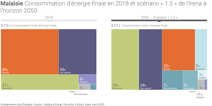Selon l'Irena, la Malaisie pourrait ainsi s'appuyer sur son potentiel important de ressources locales pour porter la part des énergies renouvelables à plus de la moitié de sa consommation d'énergie finale à l'horizon 2050 (dans son scénario « 1.5 » avec un mix électrique reposant quasiment totalement sur les filières renouvelables au milieu du XXIe siècle(2)), contre à peine 5% à l'heure actuelle.