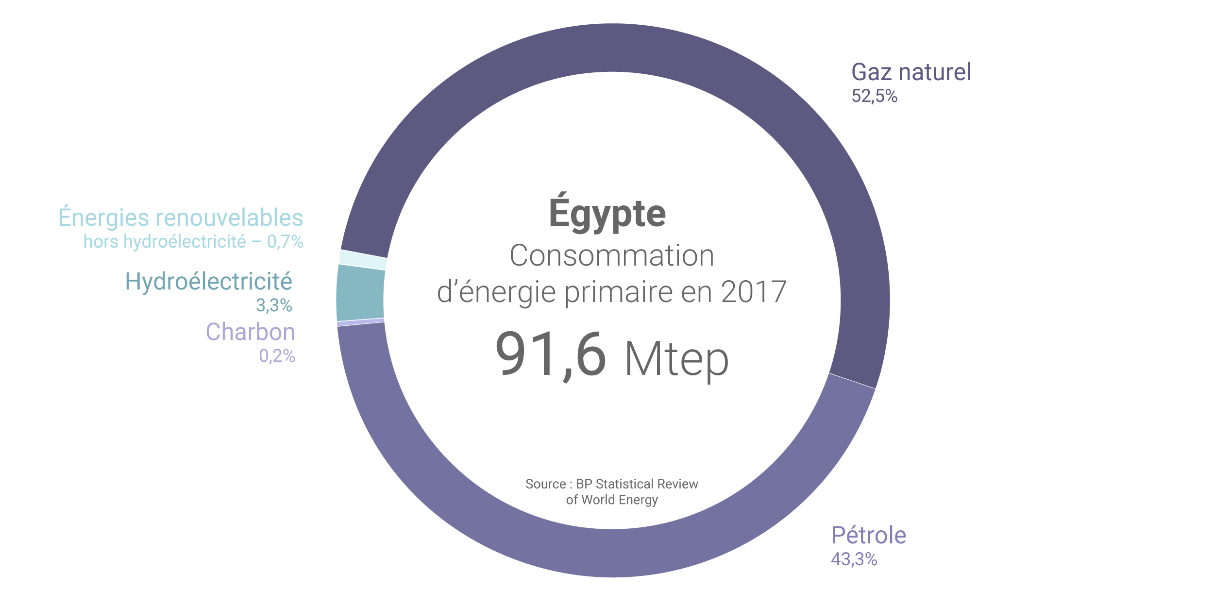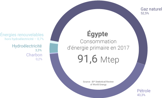 Lorsqu’il est question d’énergie en Égypte, c'est souvent au sujet du gaz naturel, en particulier depuis la découverte du gisement offshore géant de Zohr en août 2015(1). En 2017, cette énergie a compté à elle seule pour 52,7% de la consommation égyptienne d’énergie primaire(2).
