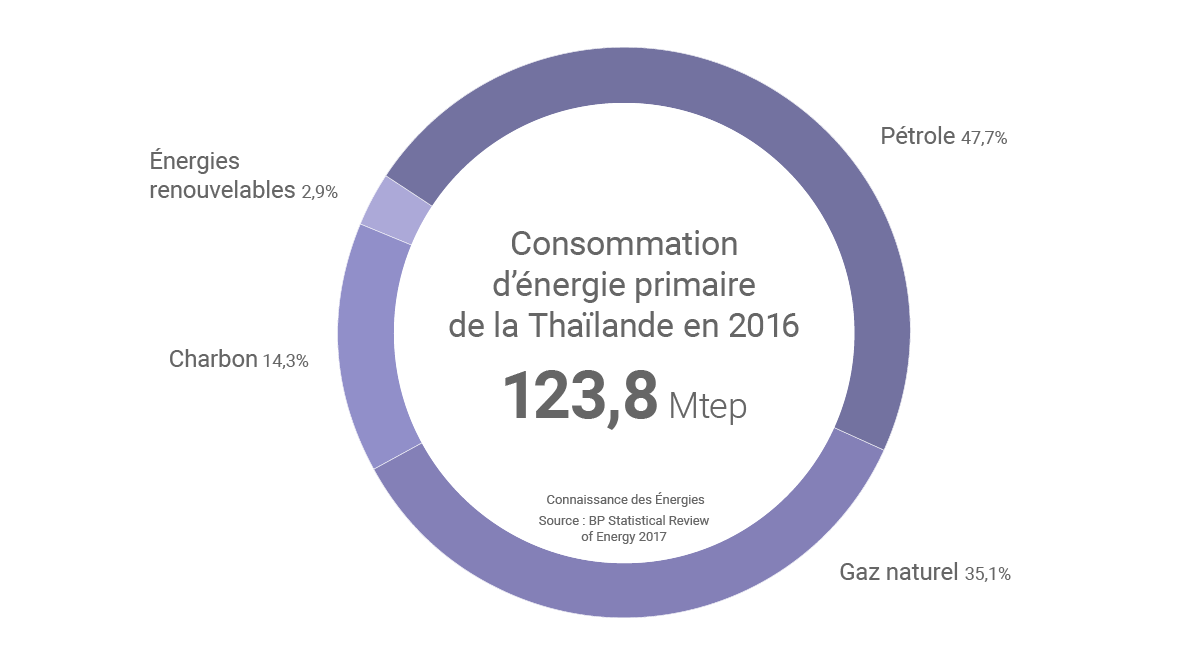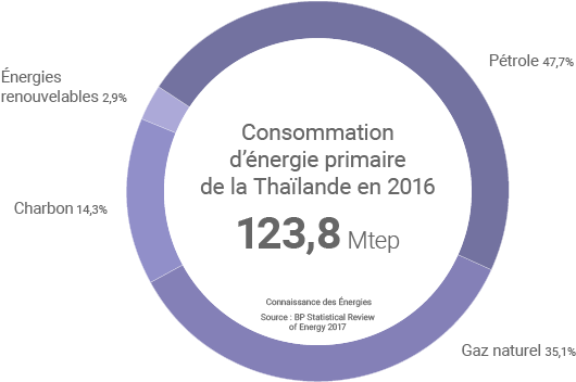 En 2016, la consommation d'énergie primaire de la Thaïlande reposait à près de 97% sur les énergies fossiles selon le BP Statistical Review of World Energy. (©Connaissance des Énergies)
