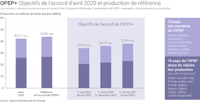 Les pays réunis au sein de l’OPEP+ se sont entendus le 12 avril pour réduire de 9,7 Mb/j leur production cumulée entre le 1er mai et le 30 juin 2020 par rapport au niveau d'octobre 2018 (sauf pour l'Arabie saoudite et la Russie, pays pour lesquels la production « de référence » est fixée à 11 millions de barils par jour). Dans son tableau de bord pétrolier publié le 16 février(2), IFP Énergies nouvelles note toutefois que cet engagement « correspond à une baisse réelle de 7,5 Mb/j (hors Iran, Libye, Venezuela) » par rapport au niveau de février 2020, un effort « notoirement insuffisant » face à la chute de la demande(3).