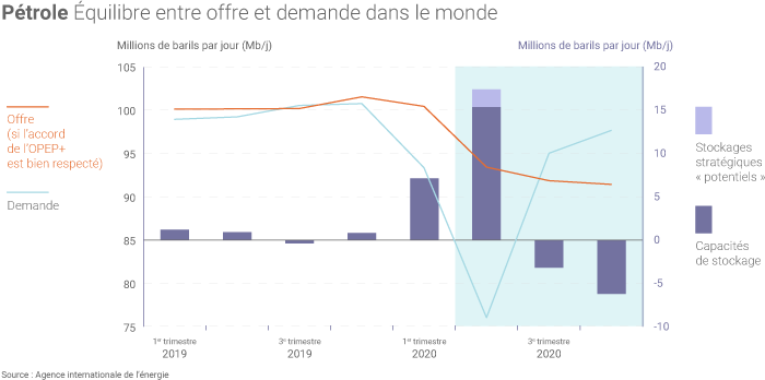 IFP Énergies nouvelles estime que les excédents cumulés de pétrole entre avril et juin 2020 pourraient avoisiner 1,4 milliard de barils (Gb) au niveau mondial. « Cela signifie que les capacités de stockage disponibles, estimées entre 0,9 et 1,8 Gb, seraient soit insuffisantes, soit saturées », précise l’organisme dans sa note du 16 avril. Face à cette situation, l’AIE indique que « 4 pays (Chine, Corée du Sud, États-Unis, Inde) ont mis leurs capacités de stockages stratégiques à disposition de l’industrie pour stocker temporairement les barils indésirables ou envisagent d’augmenter ces stocks stratégiques pour profiter des prix bas ».