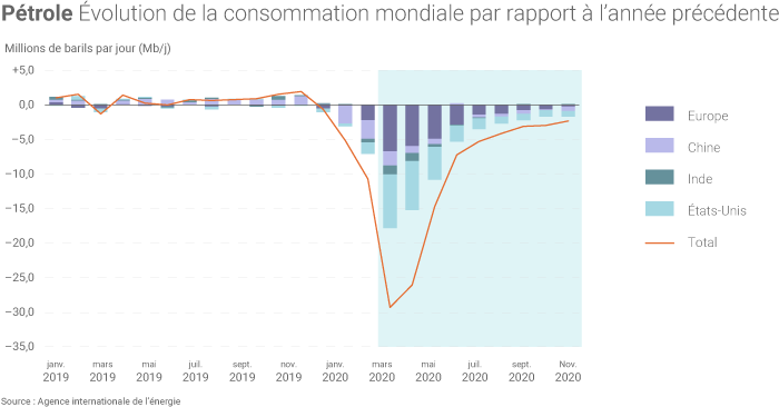 Sur l’ensemble de l’année 2020, l’AIE estime que la consommation de pétrole pourrait être inférieure de 9,3 Mb/j au niveau de 2019.