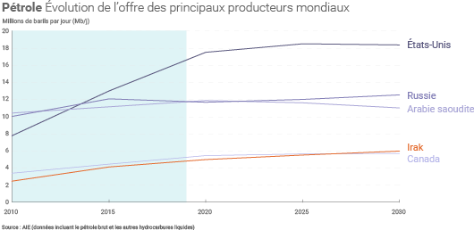 Au cours de la dernière décennie, le secteur pétrolier irakien a connu « de fortes turbulences » mais a réussi - malgré la guerre contre le groupe État Islamique et les fortes variations des cours mondiaux du brut - à doubler sa production, souligne l’AIE. Au niveau mondial, l’Irak est désormais le 5e producteur de pétrole (près de 4,7 millions de barils par jour en 2018(2)) et le 3e exportateur de brut.