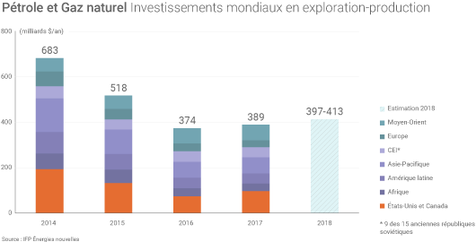 A partir de ces hypothèses de prix, IFP Énergies nouvelles estime que les investissements en exploration-production pourraient augmenter de 2% à 6% en 2018, « avec là encore une croissance concentrée sur l’Amérique du Nord ». Les investissements mondiaux se situeraient alors dans une fourchette de 397 à 413 milliards de dollars en 2018. Pour rappel, ceux-ci avaient atteint 683 milliards de dollars en 2014.