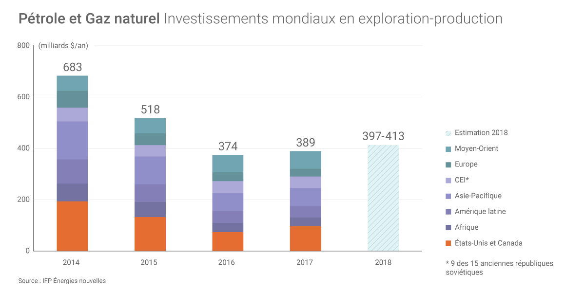 A partir de ces hypothèses de prix, IFP Énergies nouvelles estime que les investissements en exploration-production pourraient augmenter de 2% à 6% en 2018, « avec là encore une croissance concentrée sur l’Amérique du Nord ». Les investissements mondiaux se situeraient alors dans une fourchette de 397 à 413 milliards de dollars en 2018. Pour rappel, ceux-ci avaient atteint 683 milliards de dollars en 2014.