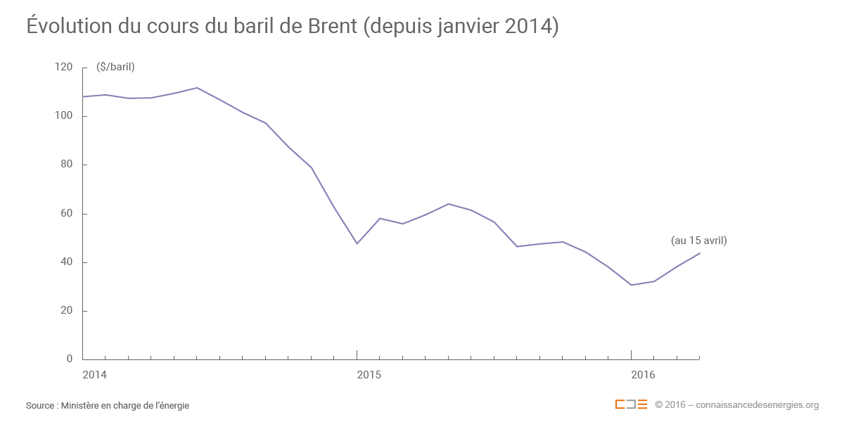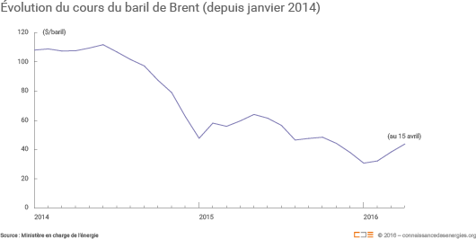 Au 1er trimestre 2016, le prix du baril de Brent a atteint 33 $ en moyenne avec une tendance haussière (38,4 $ en mars contre 30,7 $ en janvier). Pour rappel, il a baissé des deux tiers par rapport à 2014 (99 $/baril) et reste encore inférieur de 36,5% à la moyenne de 2015 (52 $/baril).