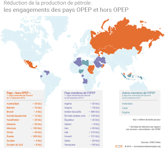 Dans le cadre des accords du 30 novembre et du 10 décembre, membres de l'OPEP et pays « non-OPEP » se sont au total engagés à réduire leur production pétrolière de presque 1,8 Mb/j. (©Connaissance des Énergies)