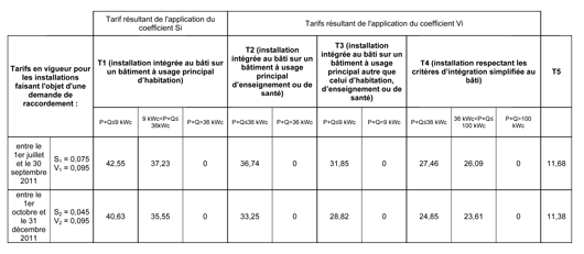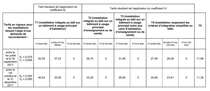 Ce nouveau cadre explique les baisses des tarifs d’achat de 10% en mars 2011 et de 8% à 10% en juillet 2011, ainsi que la baisse actuelle d’octobre. Pour les demandes de raccordement d’installations de moins de 9 kWc dans le résidentiel, déposées entre le 1er octobre et le 31 décembre 2011, le tarif d’achat est désormais de 40,6 c€/kWh, contre 42,6 c€/kWh précédemment. D’autres baisses sont attendues le 1er janvier 2012 et le 1er avril 2012.
