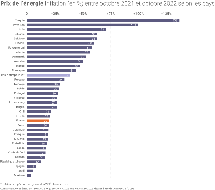 L'AIE souligne que la crise énergétique actuelle, déclenchée par l'invasion de l'Ukraine par la Russie, a renforcé les inquiétudes en matière de sécurité énergétique. Dans l'Union européenne, les prix de l'énergie pour les consommateurs ont augmenté en moyenne de 39% entre octobre 2021 et octobre 2022.