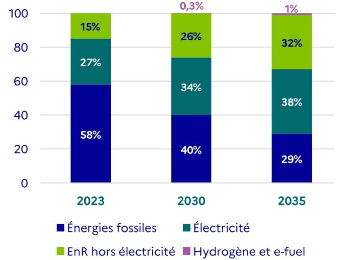 Mais la PPE 3 ne se limite pas à esquisser le paysage électrique de la France dans la décennie à venir. Et pour cause : un objectif central de la feuille de route est de faire passer la part des énergies fossiles dans la consommation finale d'énergie de la France à 40% en 2030, contre 58% en 2023, ce qui exige de favoriser également les filières bas carbone non électriques.