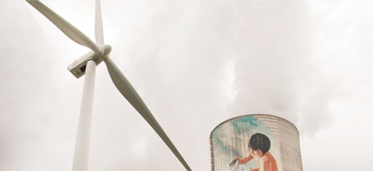 Éolienne et tour de refroidissement d’un réacteur nucléaire sur le site de Cruas Meysse en Ardèche (©EDF-Robert Fhal)