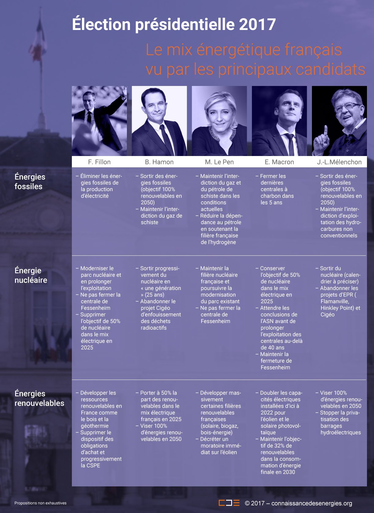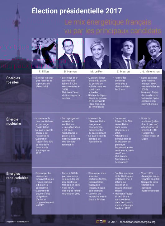 Emmanuel Macron s’inscrit globalement dans la continuité de la loi de transition énergétique adoptée à l’été 2015 : il compte conserver l’objectif de 50% de nucléaire dans le mix électrique français à l’horizon 2025 (en maintenant la fermeture de la centrale de Fessenheim), tenir l’objectif de 32% d’énergies renouvelables dans la consommation finale d’énergie en France en 2030 et porter la contribution climat-énergie à 100 €/t de CO2 en 2030. Emmanuel Macron s’engage par ailleurs à doubler d’ici à 2022 les capacités éoliennes et photovoltaïques installées en France. Il appelle à raccourcir et simplifier les procédures d’installation des énergies renouvelables.