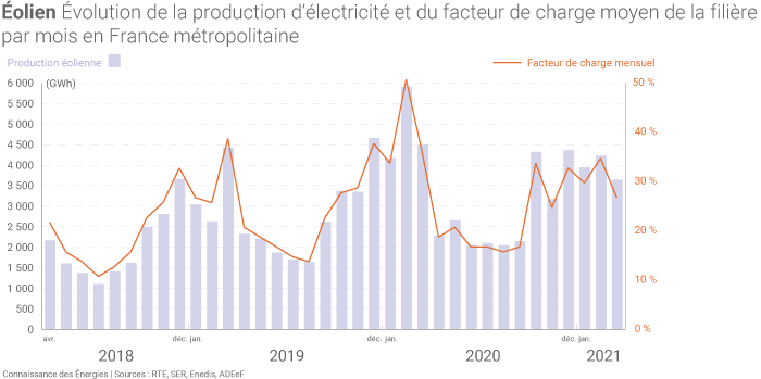 La production d'électricité d'origine renouvelable dans son ensemble s'est élevée à 36,05 TWh au 1er trimestre 2021. Elle est en baisse de 4% par rapport au 1er trimestre 2020, en raison d'un important recul de la production éolienne (- 19% entre le 1er trimestre 2020 et le 1er trimestre 2021, malgré une hausse de 1 175 MW des capacités éoliennes entre ces deux périodes). La filière éolienne avait en effet bénéficié de conditions de vents particulièrement favorables début 2020, avec notamment un facteur de charge moyen avoisinant 50% au mois de février.