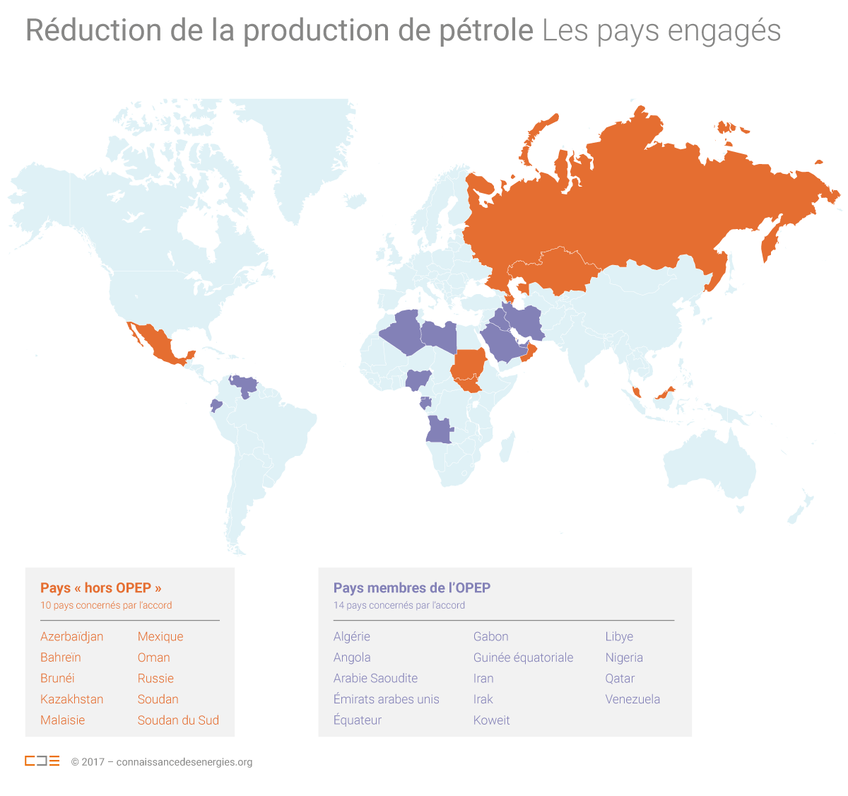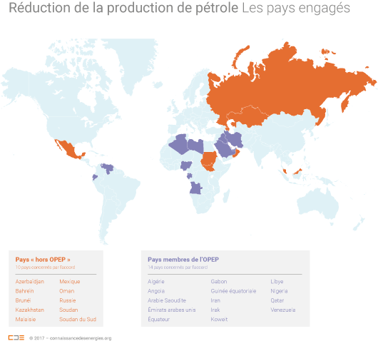 En décembre 2016, 10 producteurs non membres de l’OPEP, aux premiers rangs desquels la Russie, se sont associés à l’objectif de réduction de l’offre pétrolière (à hauteur de 558 000 barils par jour). En mai 2017, membres et non membres de l’OPEP ont convenu de poursuivre leurs efforts jusqu’à fin mars 2018.