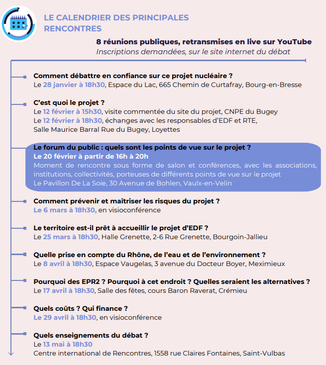 Le débat public sera constitué de 8 grandes réunions publiques (dont deux uniquement en visioconférence, toutes accessibles en ligne en direct sur YouTube). La première d'entre elles aura lieu le 28 janvier à Bourg-en-Bresse.