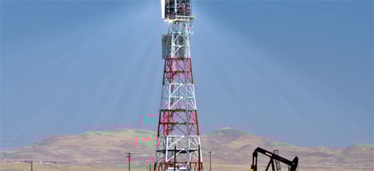 L'installation solaire à concentration construite à Coalinga produit la vapeur qui permet de fluidifier le pétrole dans le sous-sol. (©BrightSource Energy).