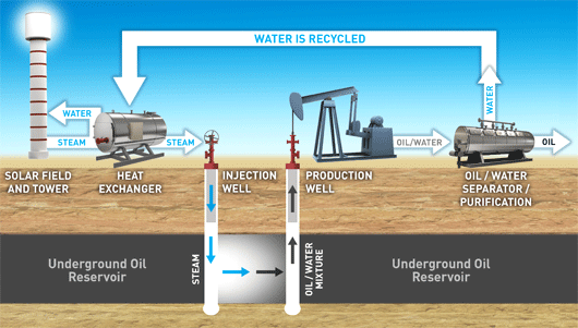 Chevron utilise la méthode thermique dans le champ pétrolifère de Coalinga en Californie. Depuis octobre dernier, la vapeur nécessaire pour fluidifier le pétrole est produite grâce à une installation solaire thermodynamique de 29 MW construite par BrightSource Energy.