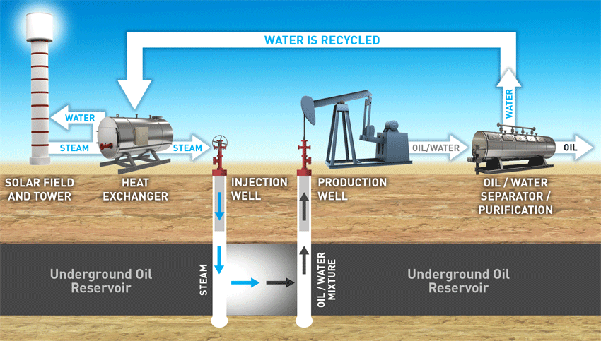 Le premier circuit d’eau évaporée chauffe un deuxième circuit de vapeur à haute température et à haute pression qui est injectée dans le puits de pétrole afin de fluidifier le pétrole. L’eau utilisée est ensuite séparée des résidus pétroliers afin d’être réutilisée (système à boucle fermée).