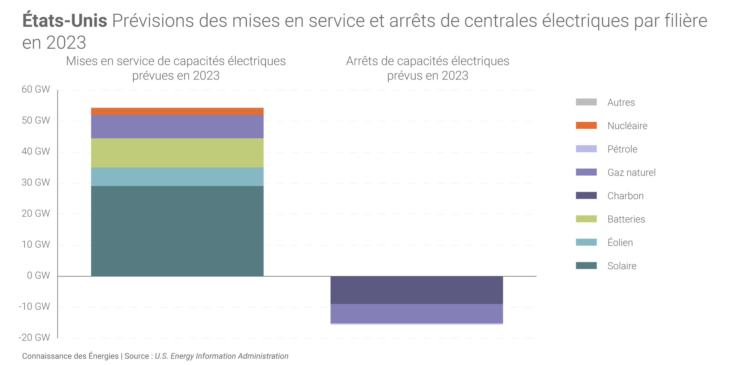 Outre les installations solaires et de stockage par batteries, l’EIA envisage en 2023 la mise en service aux États-Unis de 7,5 GW de nouvelles centrales au gaz (dont la centrale de Guernsey dans l'Ohio de 1 836 MW) et de 6 GW de parcs éoliens (en fort recul par rapport à 2020/2021(3), la mise en service d'un seul parc éolien offshore de 130 MW est prévue cette année).