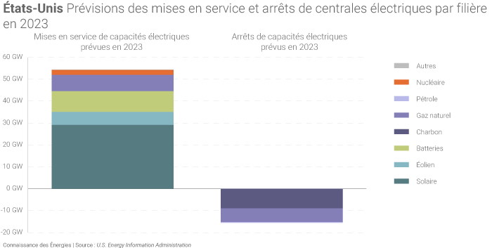 L’EIA souligne par ailleurs que les exploitants de centrales électriques lui ont communiqué leurs intentions d’arrêter près de 15,6 GW d'installations électriques en 2023. La quasi-totalité de ces arrêts prévus concernent des centrales à charbon (8,9 GW) ou à gaz (6,2 GW).