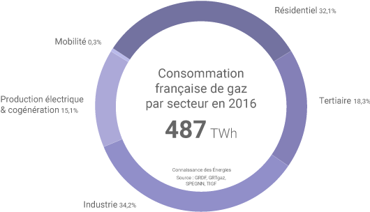 Dans le « Bilan prévisionnel gaz pluriannuel 2017-2035 » publié le 21 novembre(1), GRDF, GRTgaz, le SPEGNN(2) et TIGF(3) rappellent que la consommation française de gaz a atteint 487 TWh en 2016, soit environ 5% de plus qu’en 2015 (notamment en raison de la hausse de production des centrales à gaz l’hiver dernier). Les bâtiments résidentiels et tertiaires sont à l'origine d'un peu plus de la moitié de cette demande. Les trois régions du nord-est de la France (Ile-de-France, Grand-Est et Hauts-de-France) comptent pour près de 45,8% de la consommation nationale.