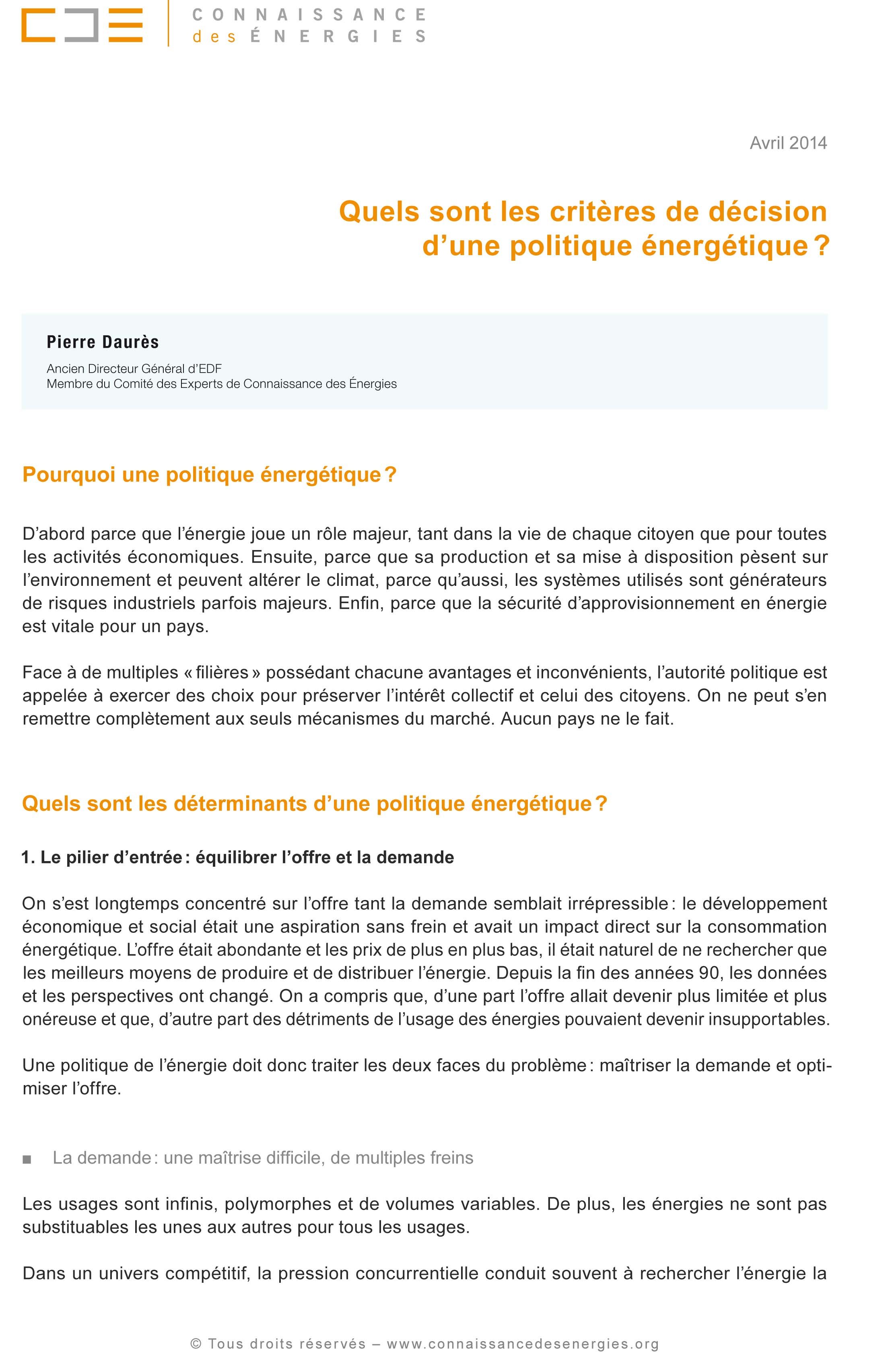 Pierre Daurès, ancien directeur général d'EDF et membre du Comité des Experts de Connaissance des Énergies, présente les critères auxquels sont confrontés les décideurs pour façonner une politique énergétique.