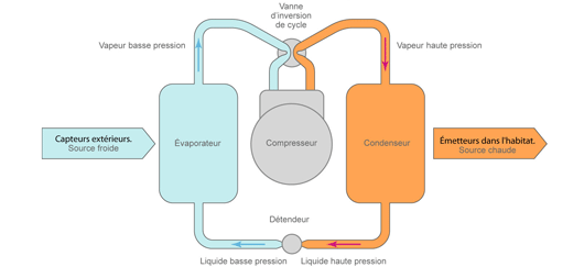 Le cas d’un chauffage est retenu ici pour l’explication. Schématiquement, il s’agit de « refroidir le froid pour réchauffer le chaud ».
