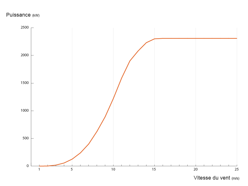 Courbe de puissance de l'éolienne E70/2300 d'Enercon selon la puissance et la vitesse du vent