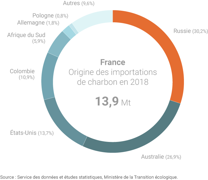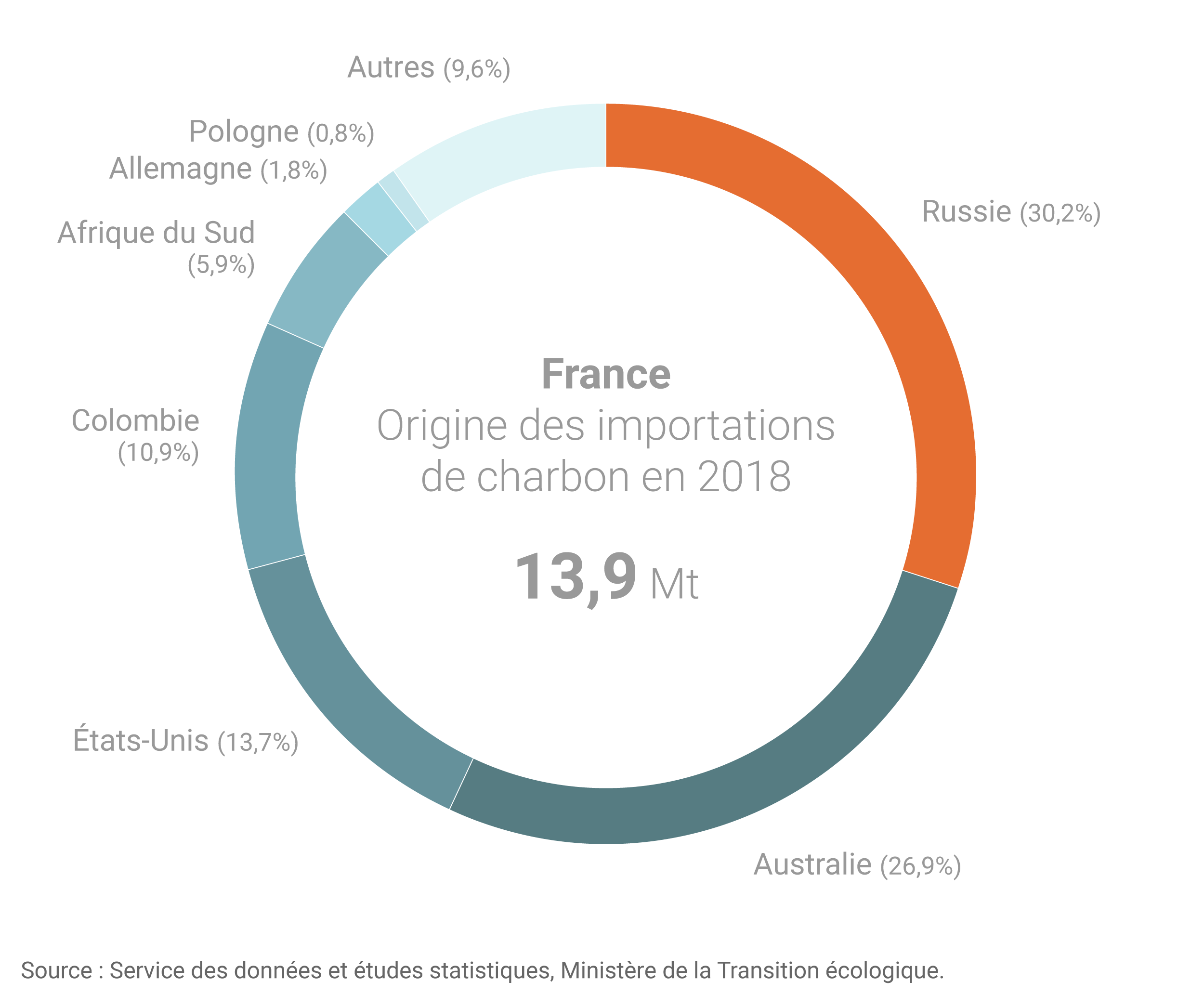 Depuis l'invasion de l'Ukraine par la Russie, les principaux fournisseurs français de charbon sont l'Australie et les États-Unis qui ont compté à eux deux pour la moitié des importations annuelles de charbon de la France en 2023.