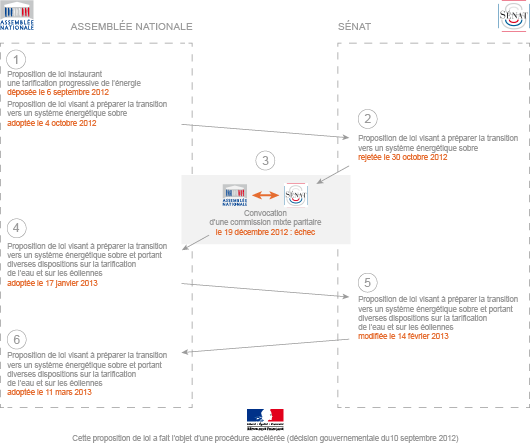En septembre 2012, le député socialiste François Brottes avait déposé à l’Assemblée nationale une proposition de loi visant notamment à instaurer une tarification progressive de l’énergie et l'eau. Six mois et plusieurs lectures du texte plus tard au sein des deux assemblées (et un échec en commission mixte paritaire), une proposition (consultable ci-après) a été adoptée en mars 2013 en lecture définitive au Palais Bourbon(4).