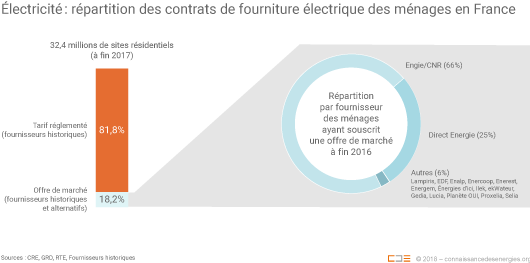 Les ménages ayant souscrit une offre de marché sont principalement clients chez les fournisseurs « alternatifs » Engie (ex GDF-Suez) et TotalEnergies (qui a racheté Direct Energie), qui disposent de plus de 4 millions de clients chacun. Hors ELD, suivent Eni avec 1 million de clients résidentiels, Sowee avec 320 000 et Mint Énergie, Octopus Energy et OHM Énergie avec environ 250 000 de clients chacun en 2024.