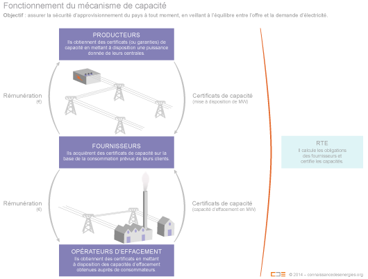 Les fournisseurs doivent acquérir des certificats délivrés par le gestionnaire du réseau électrique RTE aux opérateurs de capacité, à savoir les producteurs ou les opérateurs d'effacement. Ces certificats seront échangeables sur le marché de capacité, ce qui déterminera leur prix.