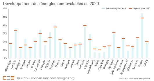Dans son paquet Énergie-Climat, l’Union européenne (UE) s’est fixé comme objectif de satisfaire 20% de sa consommation d’énergie finale en 2020 à partir des énergies renouvelables (EnR)(1). Selon le rapport d’étape(2) publié mi-juin 2015 par la Commission européenne, ces dernières se développent « de manière satisfaisante » : elles comptent pour 15,3% de la consommation finale d’énergie dans l’UE en 2014 selon les dernières estimations.