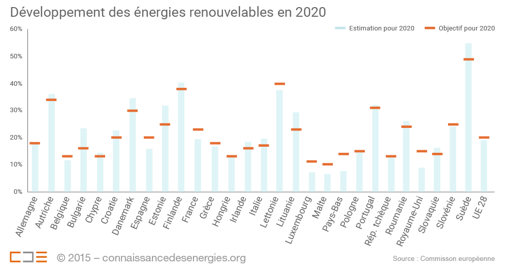 Chacun des 28 États membres dispose d’objectifs propres à l’horizon 2020 (par exemple, une part de 23% d’EnR en France). En 2013(3), 5 pays ont d’ores et déjà dépassé leurs objectifs de 2020 ou sont en passe de le faire :