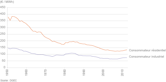 Au fil du temps, ces investissements ont été amortis et les consommateurs, résidentiels et industriels, ont vu leur facture fortement décroître, avec un prix du MWh quasiment divisé par 2 entre 1950 et 1980 pour les particuliers (en euros constants).